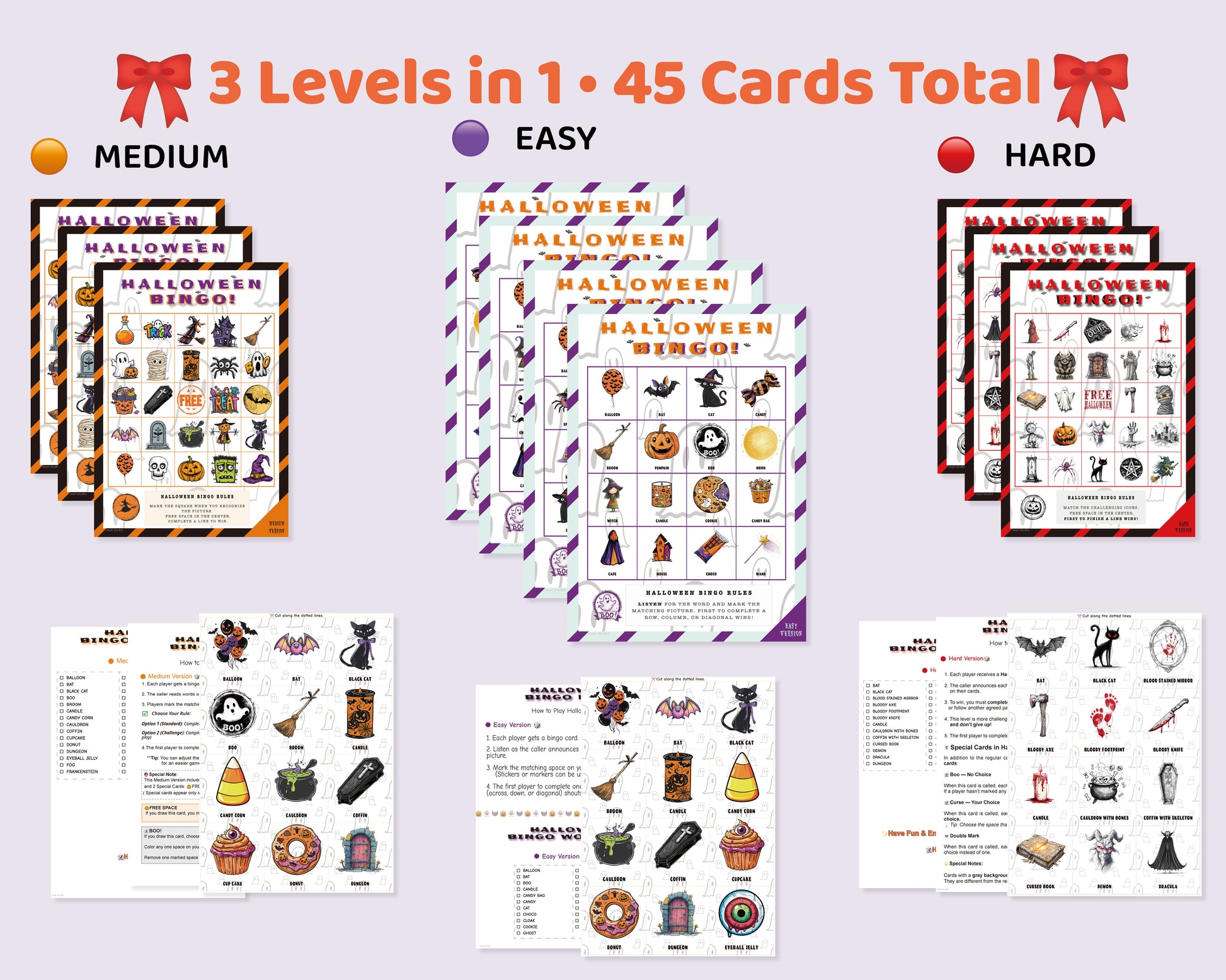 Halloween Bingo Printable Game Bundle - Easy, Medium, Hard Family Edition (Black & White)